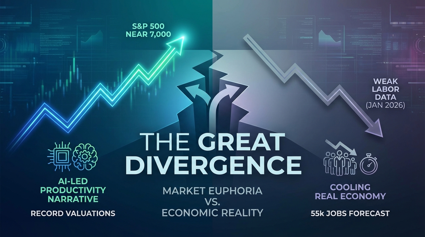 The market is currently navigating a precarious "divergence" between soaring equity valuations and a cooling real economy. Based on the analysis of the S&P 500's approach to 7,000 and the deteriorating labor outlook for January 2026, here is the comprehensive report.