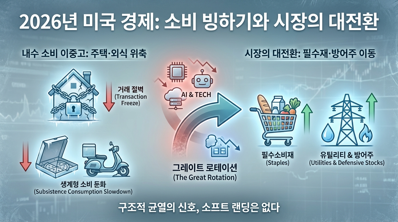 - K자형 소비의 붕괴: AI 랠리로 인한 자산 효과(Wealth Effect)로 버티던 고소득층마저 고금리 장기화와 주택 거래 실종으로 지갑을 닫기 시작했으며, 이는 미국 내수 소비의 마지막 보루가 무너지고 있다는 구조적 균열의 신호입니다.