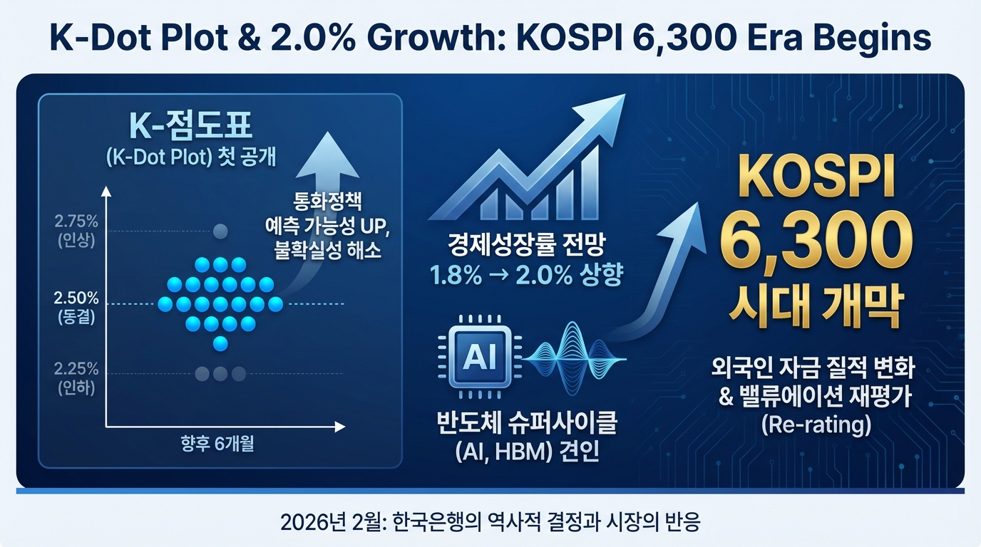 한국은행의 사상 첫 점도표 도입과 성장률 2.0% 상향은 코스피 6,300 시대를 정당화하는 강력한 '제도적·경제적 보증수표'입니다. 통화정책의 예측 가능성 제고는 외국인 투자자들에게 한국 시장이 더 이상 '불확실한 변방 시장'이 아님을 알리는 신호탄입니다.