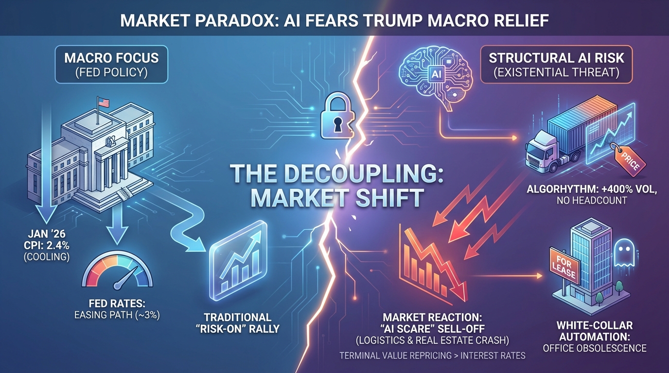 - Paradoxical Market Reaction: Despite a favorable January 2026 CPI report showing headline inflation cooling to 2.4%âa signal that would typically boost equities by validating Federal Reserve rate cutsâmarkets sold off. This divergence confirms that investor focus has abruptly shifted from macroeconomic policy (interest rates) to existential technological risk.