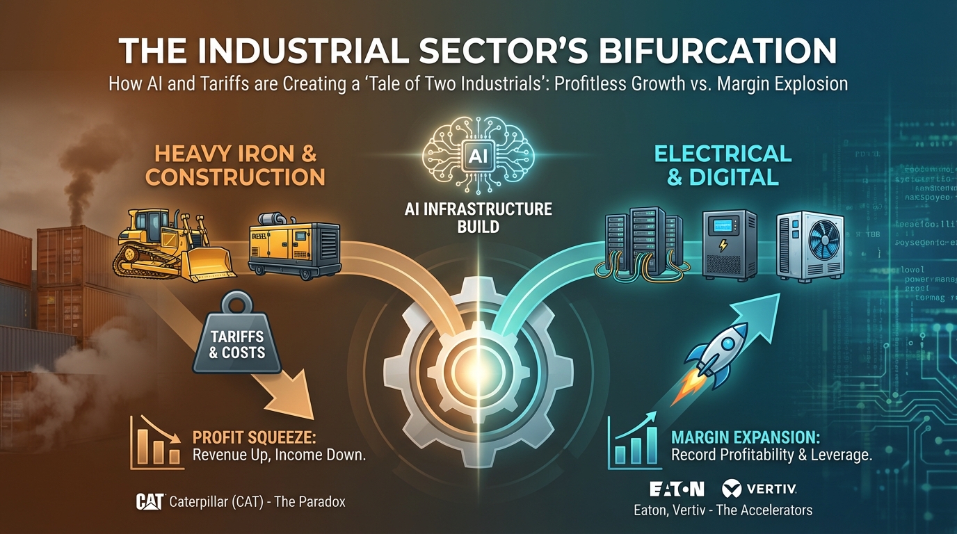 - Bifurcated Industrial Sector: Caterpillarâs "profitless growth" (18% revenue surge vs. net income decline) does not signal a sector-wide breakdown of operating leverage. Instead, it highlights a sharp divergence between "Heavy Iron" industrials (construction/mining) suffering from tariff-driven cost inflation and "Electrical/Digital" industrials (Eaton, Vertiv) which are successfully converting AI demand into record margin expansion.