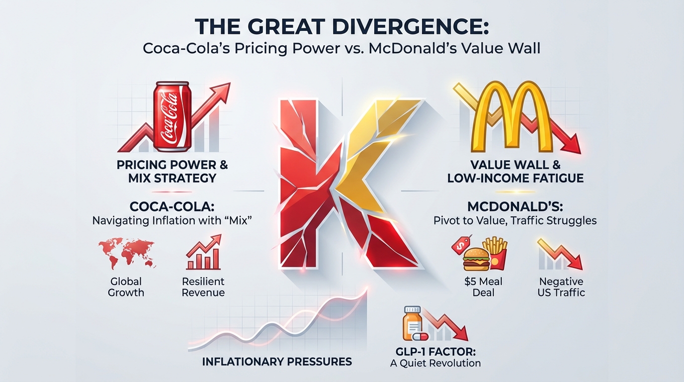 - Divergent Pricing Power: Coca-Cola continues to demonstrate exceptional pricing power, leveraging its "all-weather" strategy to maintain revenue growth (+6-7% in recent reports) despite flat volumes in developed markets. In contrast, McDonald's faces a "value wall," with low-income consumers aggressively pulling back, leading to negative US same-store sales and a forced pivot to value menus (e.g., $5 Meal Deal).