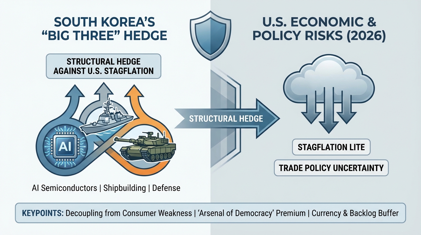 - Structural Hedge Confirmed: South Korea’s "Big Three" strategic sectors—AI Semiconductors, Defense, and Shipbuilding—are effectively decoupling from U.S. consumer weakness (stagflation). They are instead pegged to robust U.S. strategic capital expenditure (AI infrastructure, naval modernization, and supply chain security), making them a potent hedge against low growth and high inflation in the broader U.S. economy.