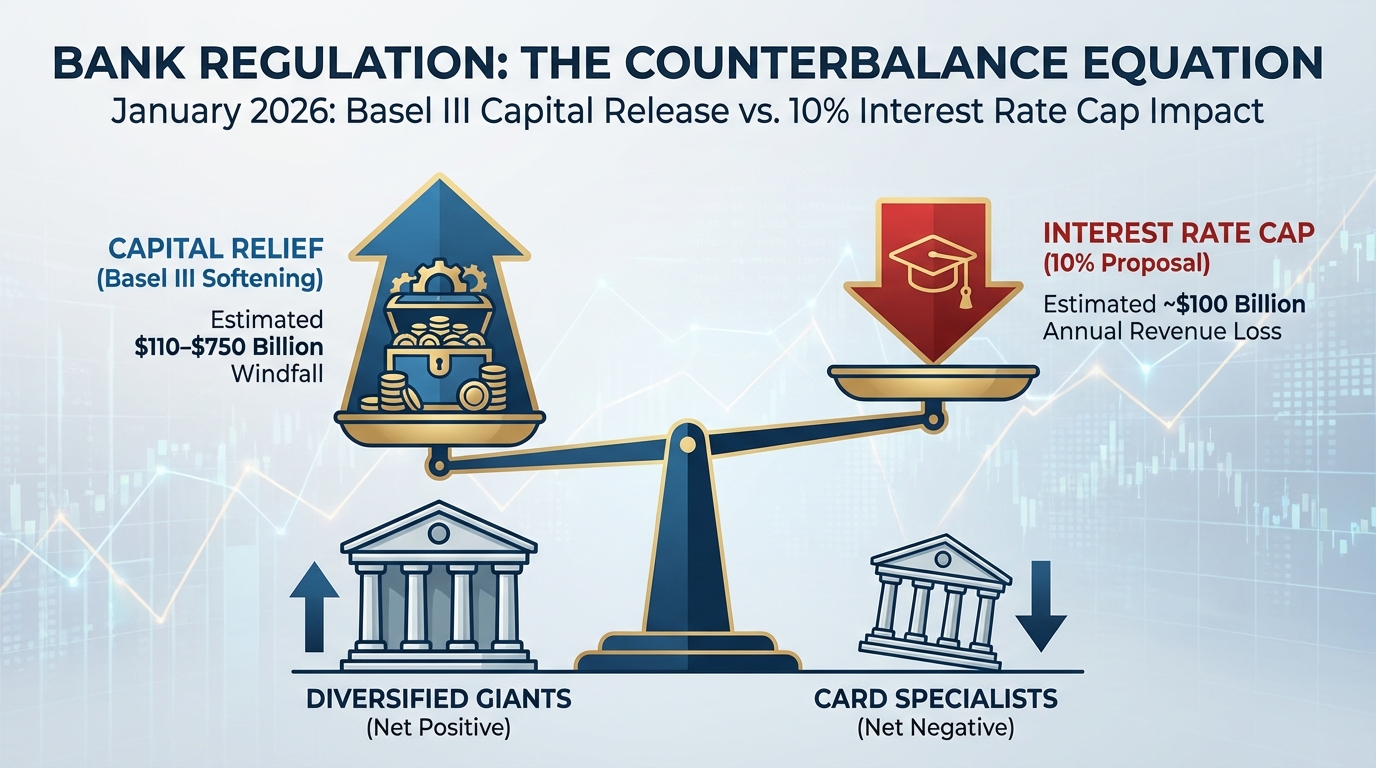 - Uneven Counterbalance: The estimated $110–750 billion capital release from softened Basel III requirements will likely outweigh the earnings erosion from the 10% interest rate cap for diversified giants like JPMorgan Chase and Bank of America, but it will fail to save card-heavy issuers like Citigroup, Capital One, and Synchrony from severe profitability shocks.