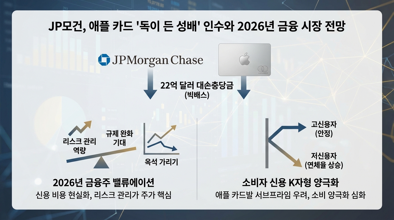 - JP모건의 "독이 든 성배" 비용 현실화: JP모건은 애플 카드 포트폴리오 인수를 위해 2025년 4분기에만 약 22억 달러(약 3조 원)의 대규모 대손충당금을 적립할 예정입니다. 이는 골드만삭스가 감당했던 부실 위험을 일시에 털어내는 '빅배스(Big Bath)' 성격으로, 2026년 JP모건의 초기 순이익 성장률에는 부담이 되겠으나 장기적으로는 불확실성을 해소하는 조치로 해석됩니다.