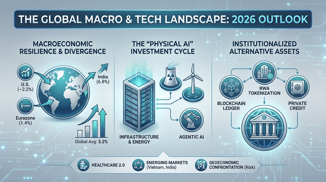 - The "Physical AI" Investment Cycle: The AI narrative has shifted from software models to infrastructure and energy. Capital is aggressively rotating into the "picks and shovels" of the AI eraāgreen energy grids, nuclear power for data centers, and advanced cooling solutionsāas "Agentic AI" (autonomous software agents) begins to drive tangible business ROI.
