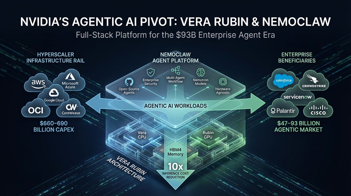 The downstream beneficiary map is clear: Salesforce, CrowdStrike, ServiceNow, and Palantir sit in the first wave of NemoClaw adoption, while cloud hyperscalers (AWS, Azure, Google Cloud, OCI, CoreWeave) channeling $660–690 billion in 2026 capex provide the infrastructure rail on which Rubin-powered agentic inference scales to enterprise production.