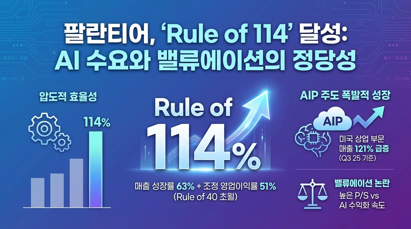 - 'Rule of 40'를 초월한 'Rule of 114' 달성: 팔란티어는 최근 분기(2025년 3분기) 기준 매출 성장률 63%와 조정 영업이익률 51%를 기록하며 합산 점수 114%라는 전례 없는 효율성을 입증했습니다. 이는 단순한 소프트웨어 기업을 넘어 AI 인프라의 독보적 지위를 방증합니다.