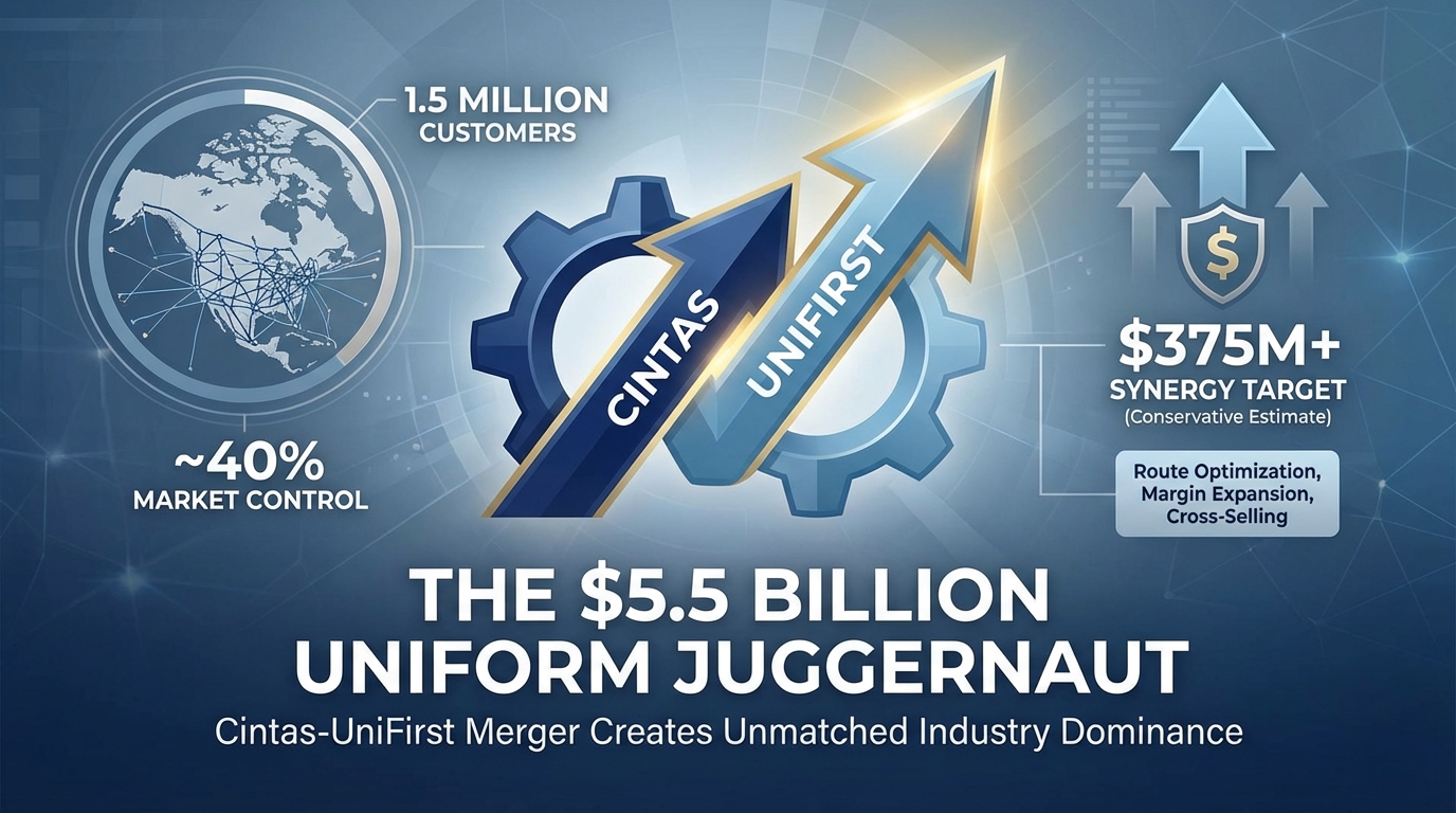 - The Cintas-UniFirst $5.5 billion merger creates an unmatched industry juggernaut that will serve approximately 1.5 million business customers, combining the #1 and #3 players in North American uniform services and potentially controlling over 40% of the marketâa scale advantage that no remaining competitor can credibly challenge.
