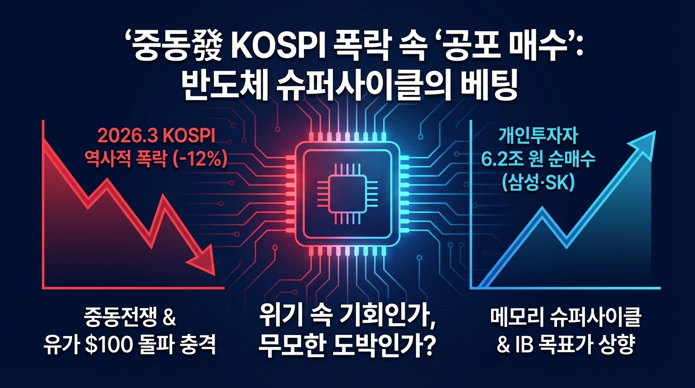 한국 개인투자자들은 2026년 3월 중동전쟁 발 KOSPI 12% 역사적 폭락 속에서 삼성전자와 SK하이닉스를 1주일간 약 6.24조 원 순매수하며 '공포 매수'에 나섰다. 유가 100달러 돌파와 GDP 성장률 0.45%p 하향 리스크에도 불구하고, 메모리 슈퍼사이클 펀더멘털에 대한 확신이 이 역매수를 이끌었다.