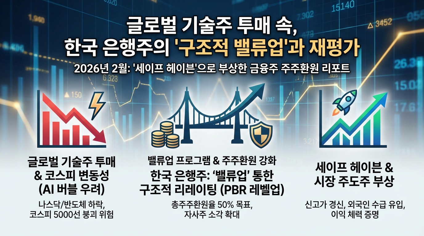 - '세이프 헤이븐'으로서의 지위 확립: 2026년 초 글로벌 AI 거품론과 기술주 투매로 인한 코스피 5,000선 공방 속에서도, 주요 금융지주사는 신고가를 경신하며 반도체 섹터의 변동성을 상쇄하는 확실한 대안 투자처이자 시장 주도주로 부상했습니다.