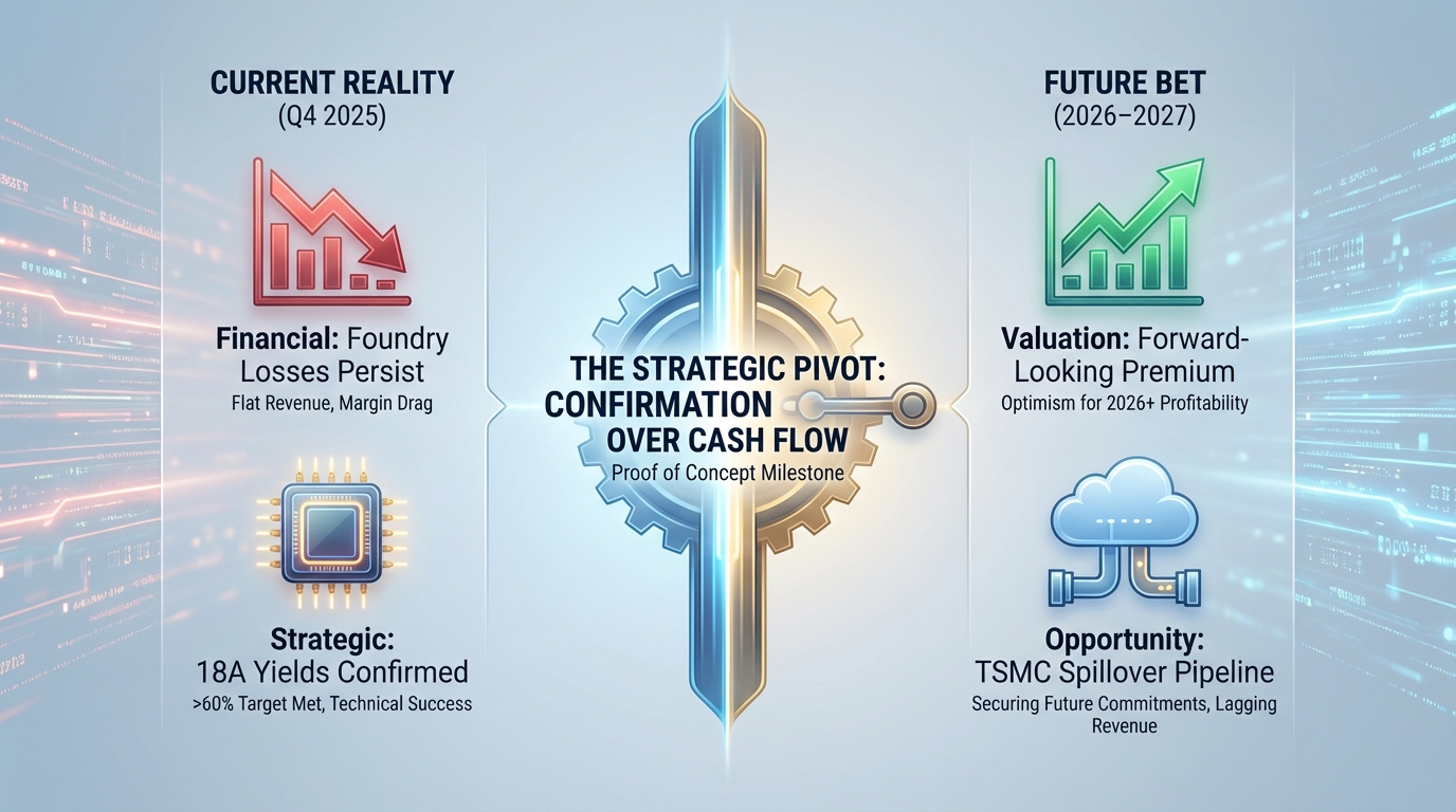 The stock's valuation assumes that the "pain" of 2024â2025 is finished and the "gain" of 2026â2027 is inevitable. As long as Intel confirms that 18A is on track for mass production and that the "TSMC overflow" customers are signing contracts for 2026, the market will likely look past the ugly Q4 financial losses and keep the rally alive.