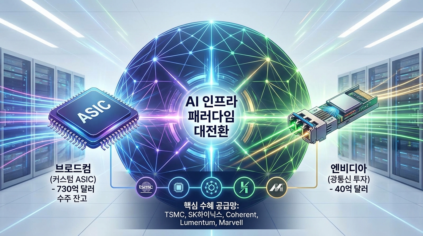 브로드컴의 730억 달러 AI 수주 잔고와 엔비디아의 40억 달러 광통신 투자는 '경쟁'이 아니라 동일한 메가트렌드의 서로 다른 표현이다. AI 인프라는 더 이상 단일 칩의 성능이 아니라 '시스템 수준의 통합'으로 승부가 결정된다.
