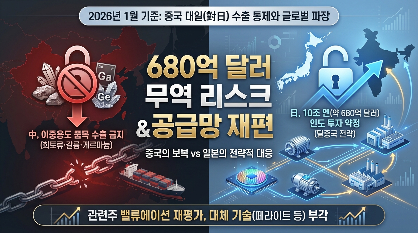 2026년 1월 8일 기준, 중국의 대일(對日) 수출 통제 조치와 이로 인한 680억 달러 규모의 무역 리스크가 글로벌 공급망 및 관련주에 미치는 실질적 영향을 분석한 보고서입니다.