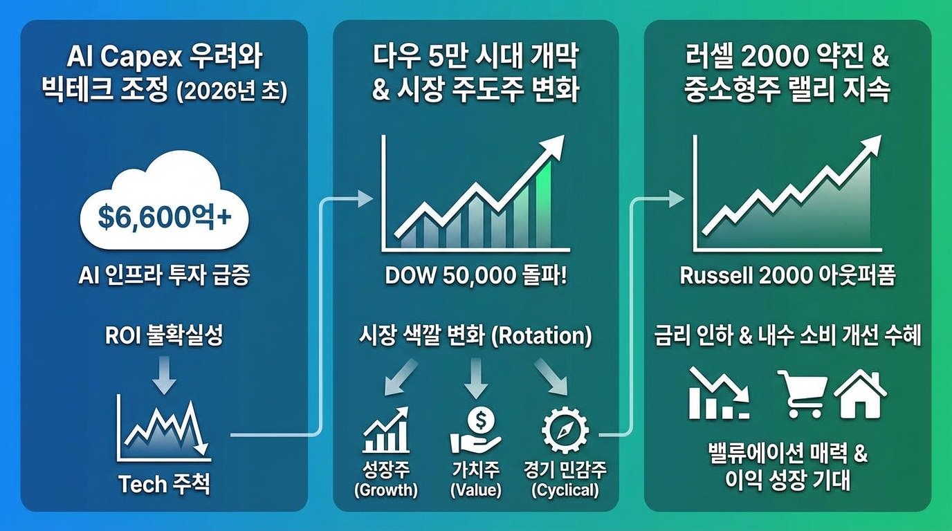 다우 5만 시대와 중소형주 랠리: AI 투자 우려 속 시장 주도주 교체 본격화